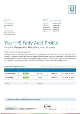 We summarize your HS Fatty Acid Profile based on the standardized Omegametrix Method in a meaningful, clearly formulated, and concise report. It provides you with information about the fatty acid composition of your red blood cells – representative of all the cells in your body. You will gain insights into the influence of fatty acids on the quality of your cells, learn more about their impacts on the body and health, and receive recommendations on how you can bring or maintain your HS-Indices in the optimum range.